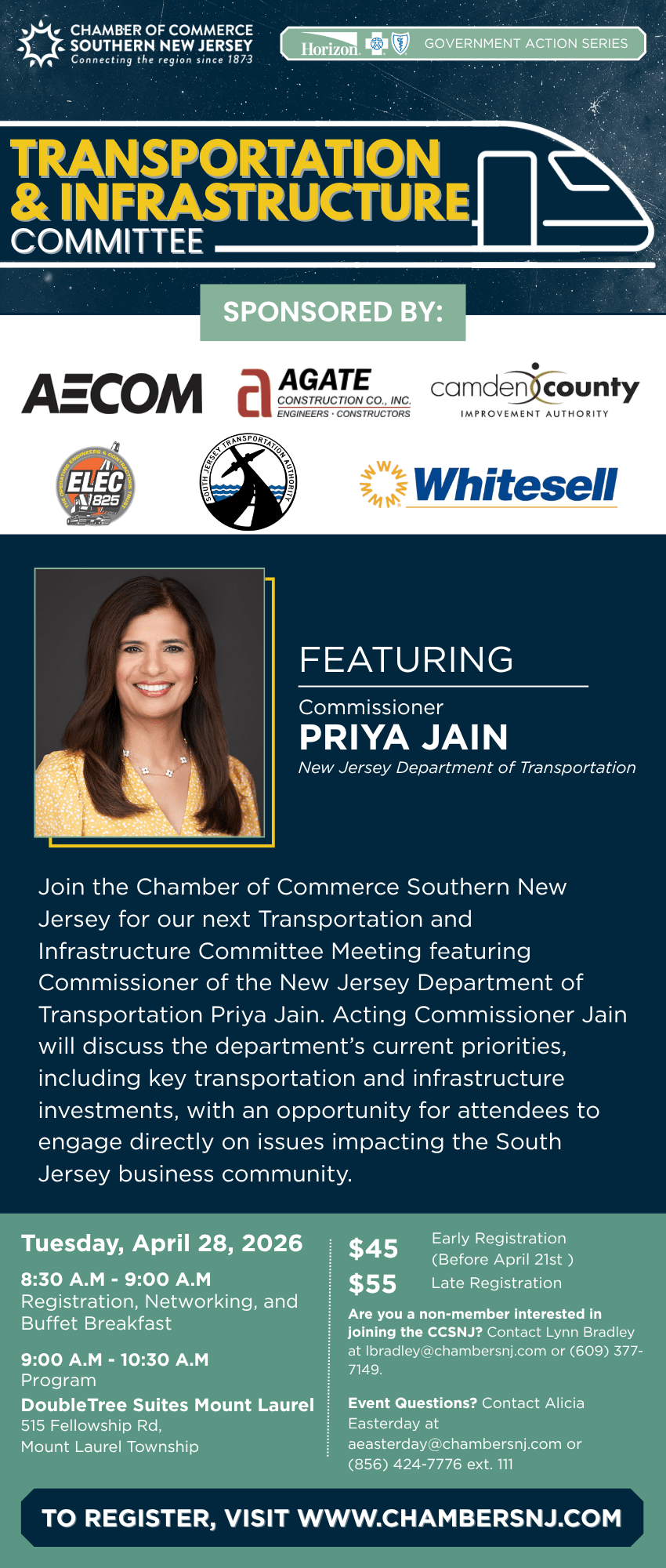 Join the Chamber of Commerce Southern New Jersey for our next Transportation and Infrastructure Committee Meeting featuring Acting Commissioner of the New Jersey Department of Transportation Priya Jain. Acting Commissioner Jain will discuss the department’s current priorities, including key transportation and infrastructure investments, with an opportunity for attendees to engage directly on issues impacting the South Jersey business community.