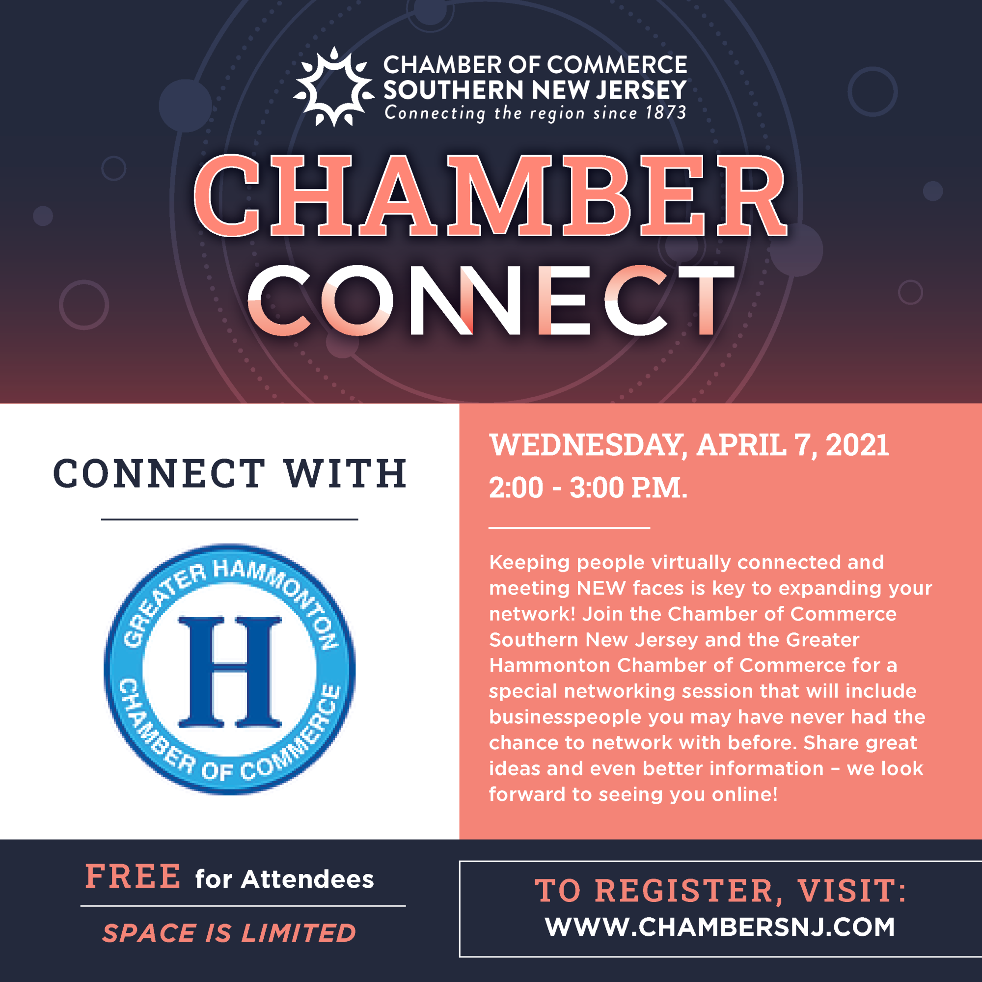 Join us on Wednesday, April 7 for CCSNJ's Chamber Connect with the Greater Hammonton Chamber of Commerce!