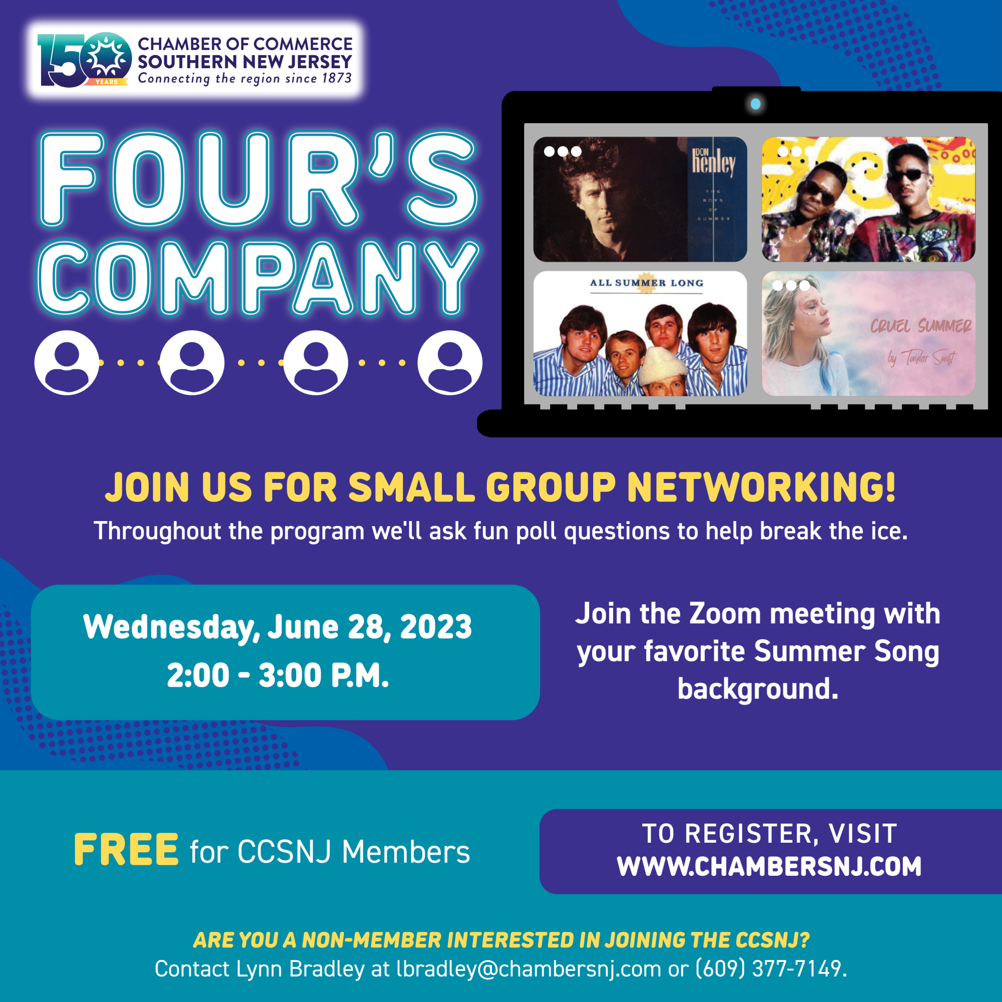 Four's Company Back to Search Four's Company Wednesday, June 28, 2023 (2:00 PM - 3:00 PM) (EDT) Description Select your Zoom Background below! Additional Info × Virtual Event Contact Coleen Daley Send Email Wednesday, June 28, 2023 (2:00 PM - 3:00 PM) (EDT) Registered Guests × Share × Print Email Add to Calendar Facebook LinkedIn X Pinterest Powered By GrowthZone Interested in Sponsoring a CCSNJ Event? For more information on CCSNJ Event sponsorship opportunities, please contact: Meredith K. Lorrilliere Executive Vice President, CCSNJ REACH OUT
