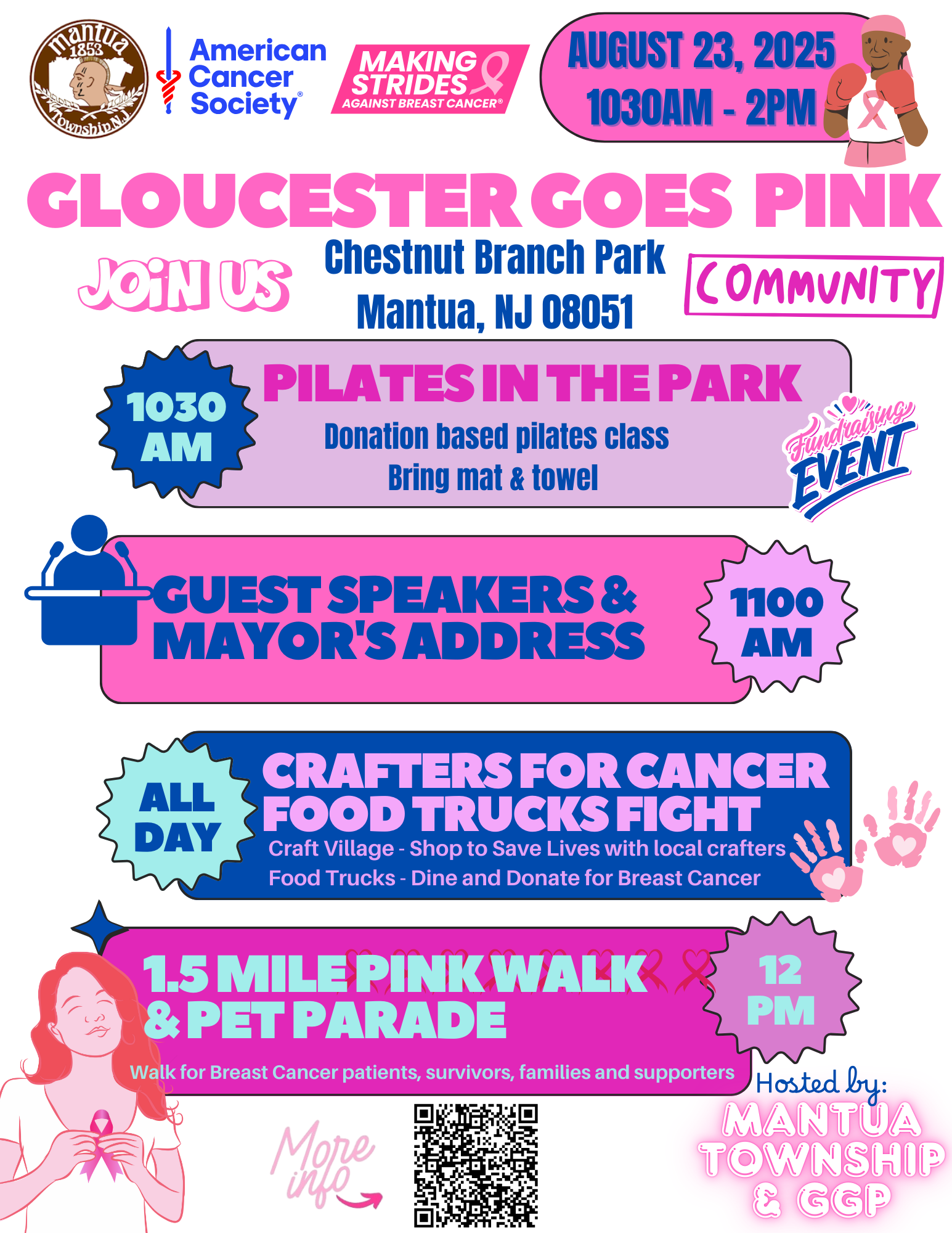 Gloucester Goes Pink - Community Festival Local Gloucester County and surrounding area business leaders, merchants, and community organizations kick off Breast Cancer Awareness Season with an event at Chestnut Branch Park in Mantua, including a 1.5-mile pink walk & pet parade.
