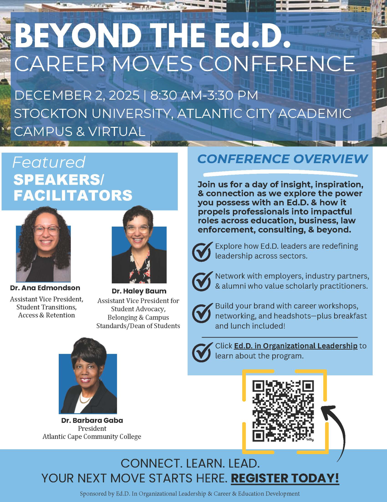 Stockton's Ed.D. in Organizational Leadership program in conjunction with the Career Education & Development present the Beyond Ed.D. Career Moves Conference planned for Tuesday, December 2nd, 8:30am-3:30pm.