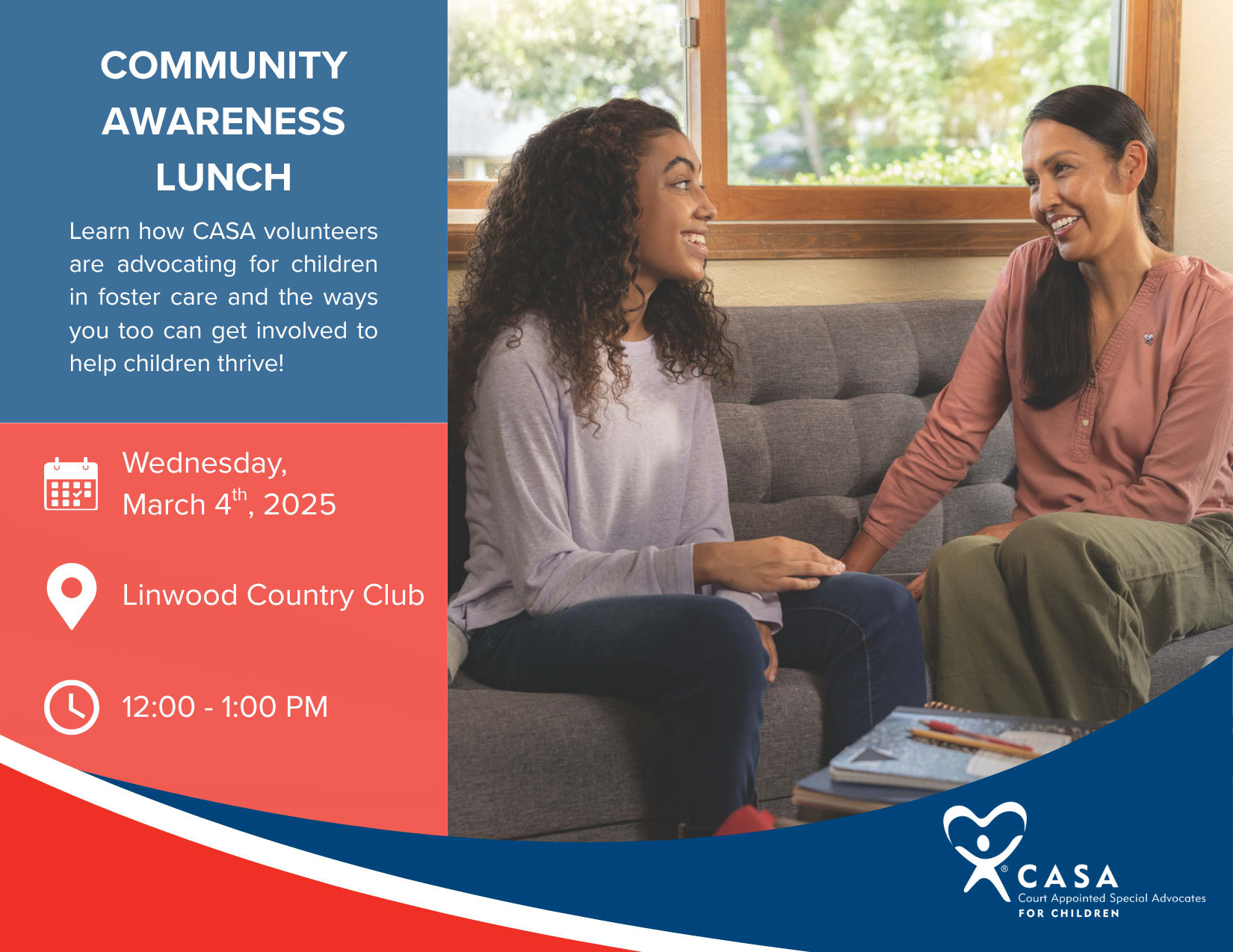 CASA’s Community Awareness event is a complimentary lunch program, where attendees will learn about CASA’s impact while helping ensure that every child has a voice in the court system. Join us for an hour of community, compassion, and commitment to making a difference in the lives of children who may have suffered from abuse or neglect. Attendees will have an opportunity to contribute financially or learn more about becoming an advocate.