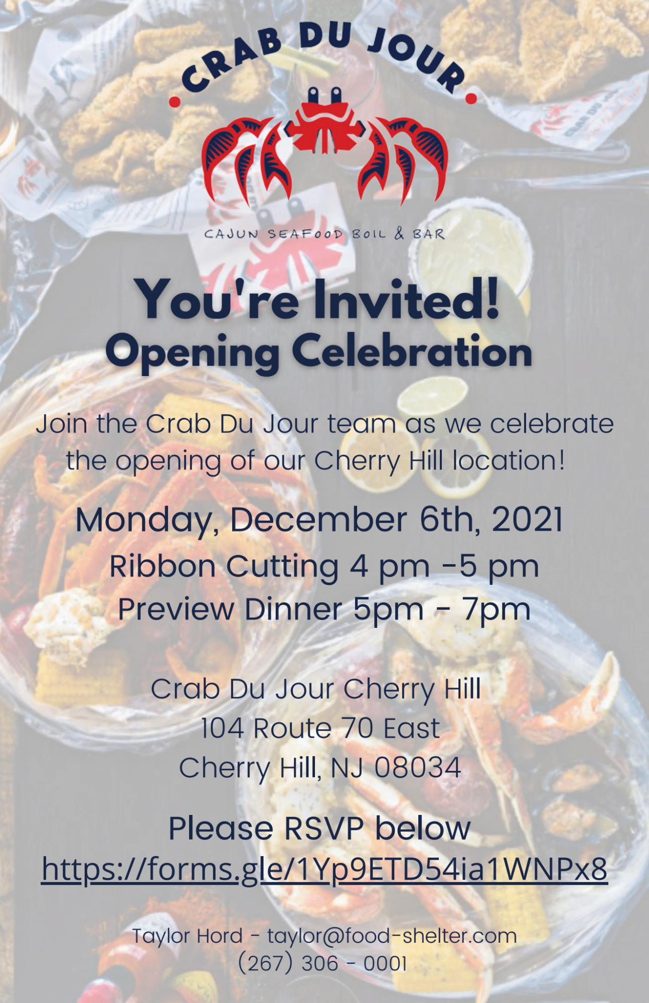 As Crab Du Jour celebrates the opening of its 13th location in the state of New Jersey, we would love to have you join us for a ribbon cutting ceremony Monday, Dec. 6 in Cherry Hill from 4-5 p.m.