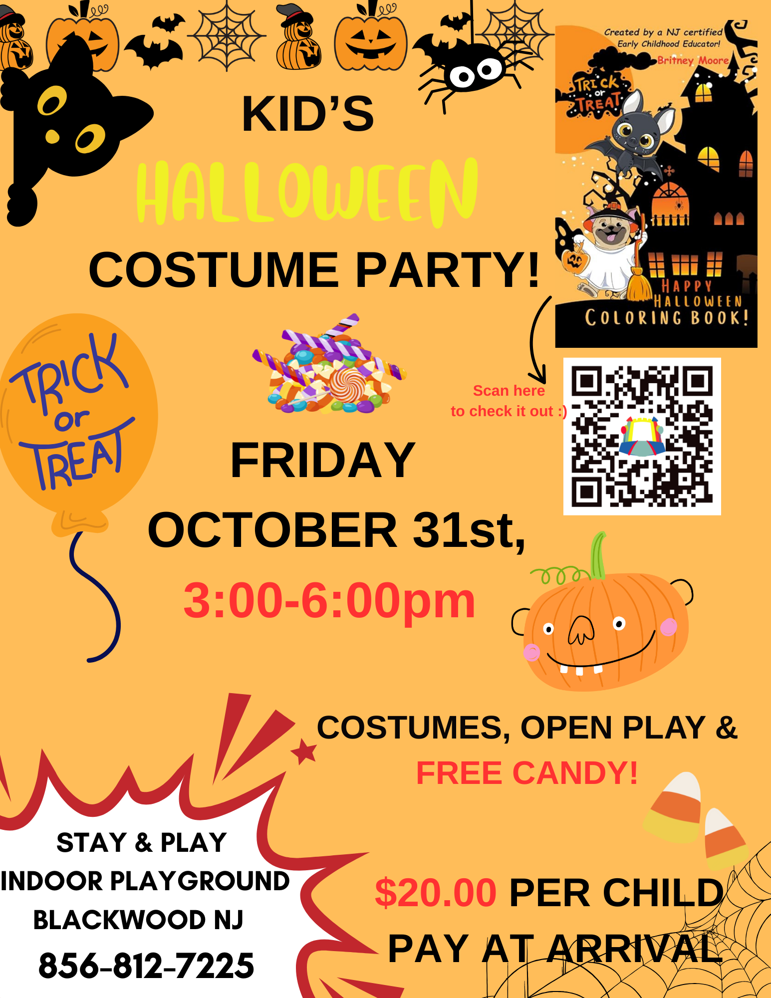 Hi everyone! This event will be held at my Indoor Playground in Blackwood NJ on Halloween from 3:00-6:00pm! I think this is a great alternative to trick or treating in residential areas :). I'm at the Gloucester Premium Outlets, by the Friendly's and Carters (park in lot B!). This event is for any/all young children. The admission is $20.00 per child, adults are free (EVERYONE WEAR SOCKS). Have your child wear their Halloween Costume and let's party! For your admission you get, OPEN PLAY and FREE CANDY! Please share this event with your friends and family, I'm a mom of two babies so any/all help advertising is DEEPLY appreciated. Thank you!