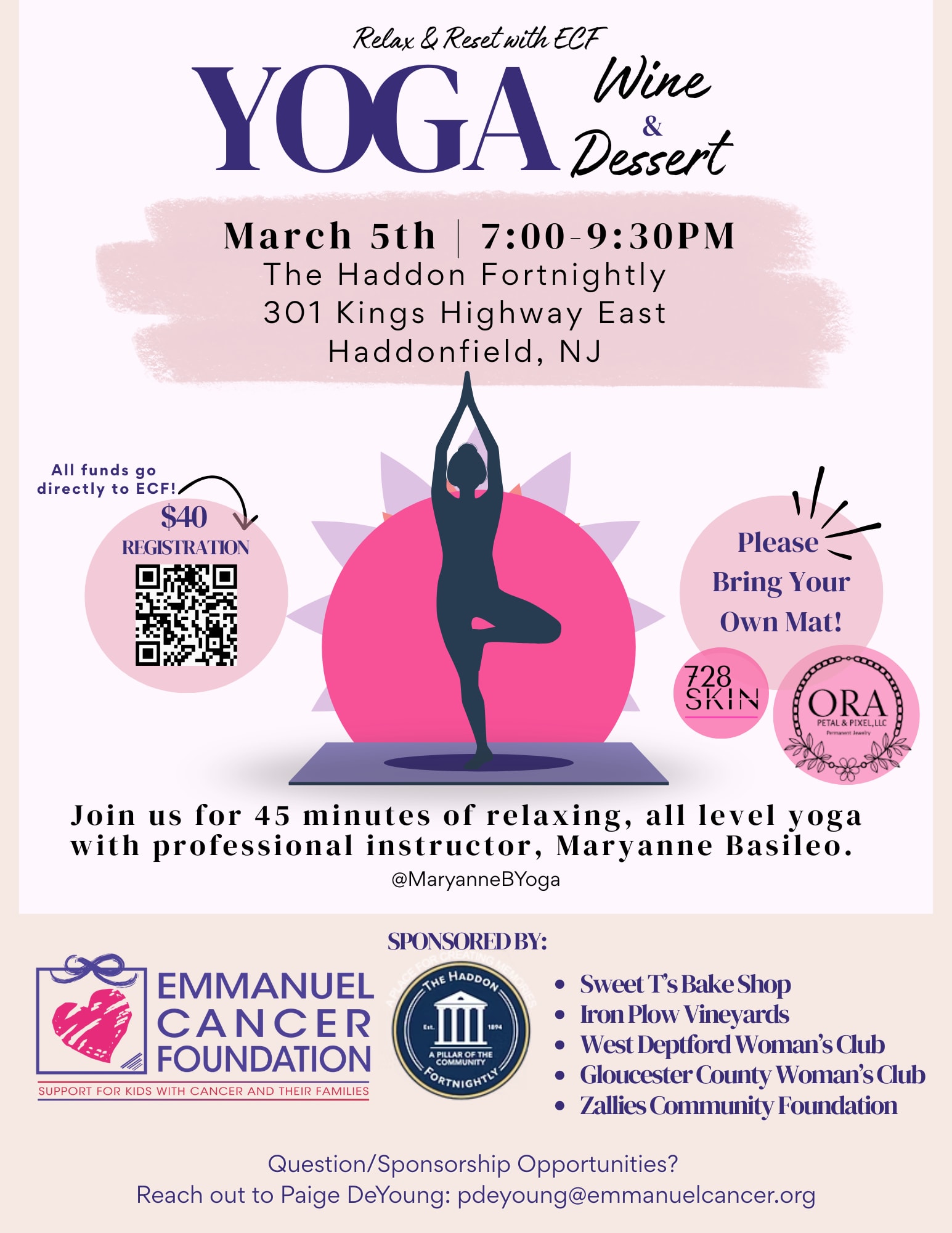 Please join Emmanuel Cancer Foundation at our Annual Yoga Event. Enjoy 45 minutes of all level yoga, with sweet treats and wine provided by our local small businesses. Come to community and to support such an impactful non-profit. For more information on ECF, check out our website: https://www.emmanuelcancer.org/