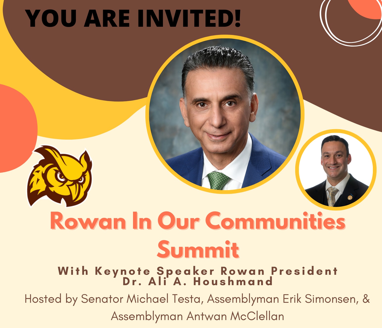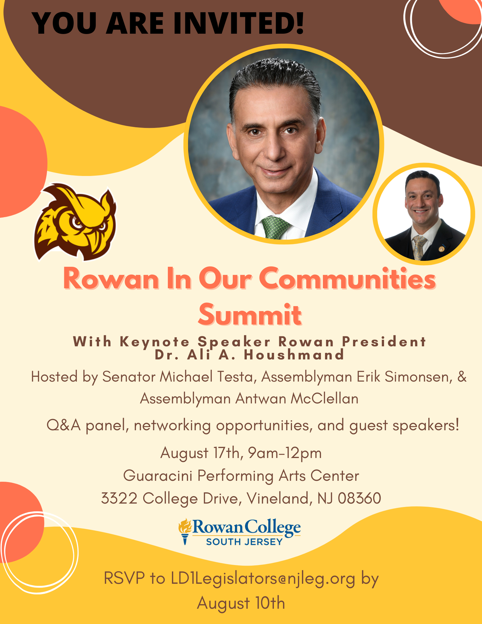 The Legislative District 1 Office would like to formally invite you to our “Rowan in Our Communities'' Summit on August 17, 2022 at the Guaracini Performing Arts Center at Rowan College of South Jersey’s Cumberland campus. This event will bring together elected officials, community groups, and local businesses to discuss how Rowan University and its community colleges can have a positive impact on all of Cumberland County. We will offer those who attend this event an opportunity to speak with the President of Rowan University, Dr. Ali Houshmand, about how Rowan can help ease the many difficulties that our county is facing coming out of the COVID-19 pandemic. This includes job creation, help for small businesses, and assisting our community groups.