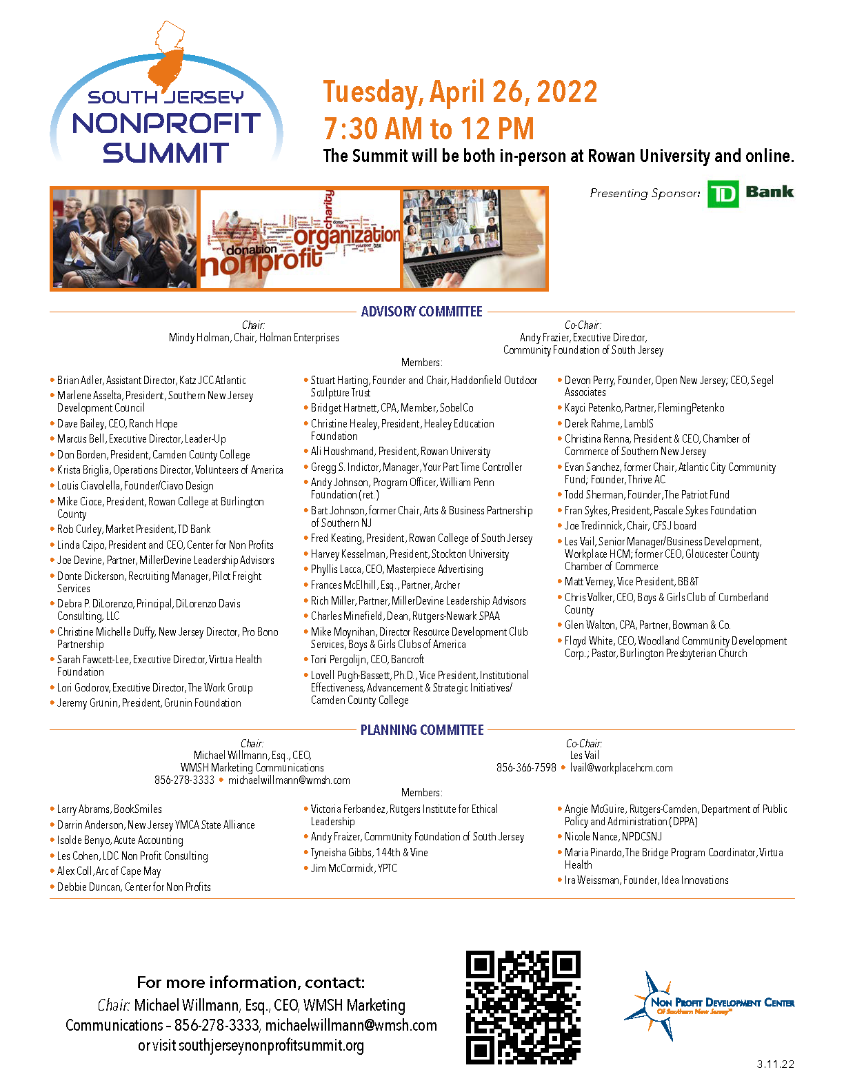 The Summit Planning Committee is chaired by Michael Willmann, Esq., CEO, WMSH Marketing Communications and co-chaired by Les Vail, Senior Manager/Business Development, Workplace HCM. Both Willmann and Vail are members of the Board of the presenting organization, the Non Profit Development Center of Southern New Jersey.