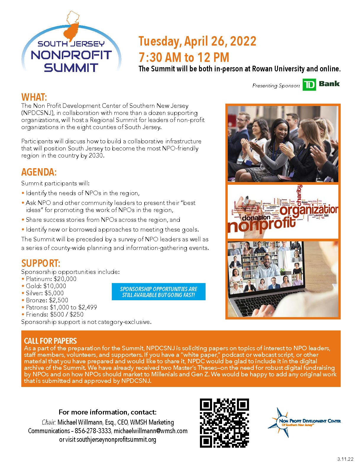 The Non Profit Development Center of Southern New Jersey (NPDCSNJ), in collaboration with 18 supporting organizations, will host the first-ever Regional Summit for leaders of non-profit organizations in the eight counties of South Jersey on April 26th.