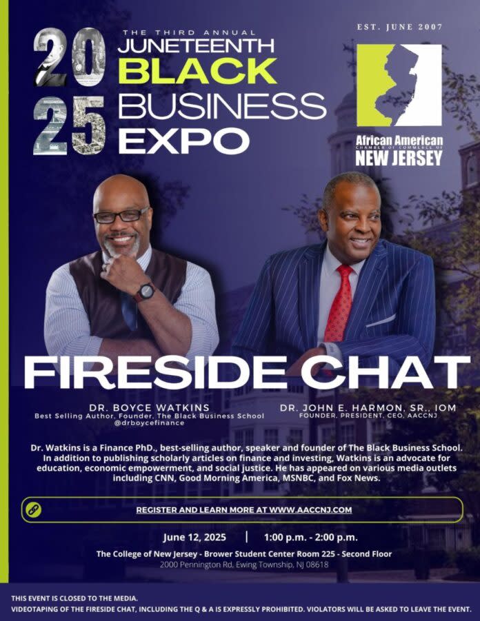 “We are pleased with Dr. Watkins’ attendance; it is significant to have his participation at the Juneteenth Black Business Expo,” said John E. Harmon Sr. “His remarks will be timely in the current economic environment. Reciprocity and accountability are our reframe at this time. One-off conversation will not get it done. We are committed to providing value in partnership with the public, private and community sectors throughout New Jersey.”