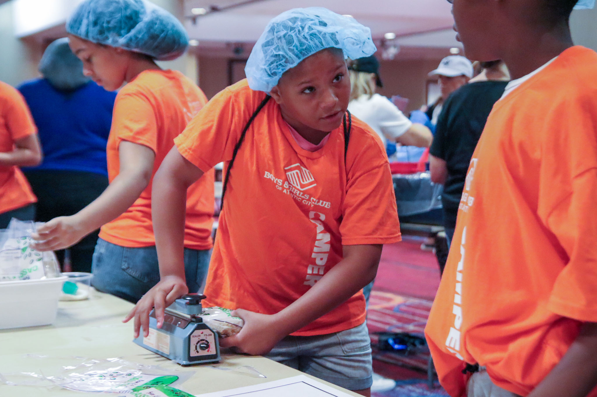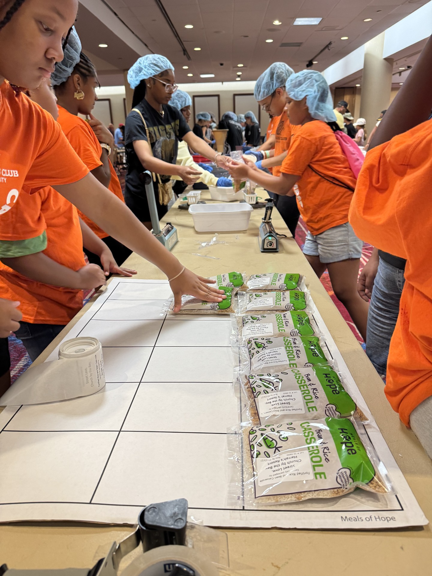 Boys & Girls Club teens form an assembly line to fill and stack thousands of meals in just a few hours.