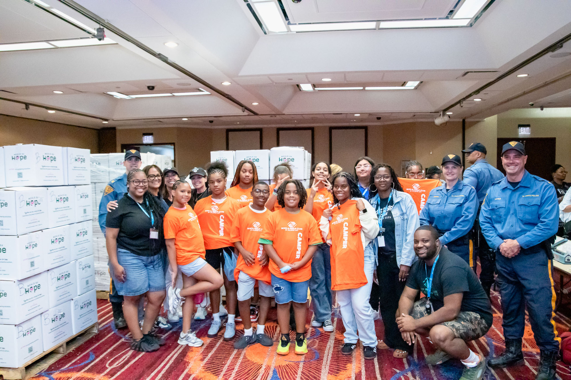 Teens and preteens from the Boys & Girls Club of Atlantic City stand proudly with law enforcement and community leaders at the Street Love Foundation’s meal-packing event.