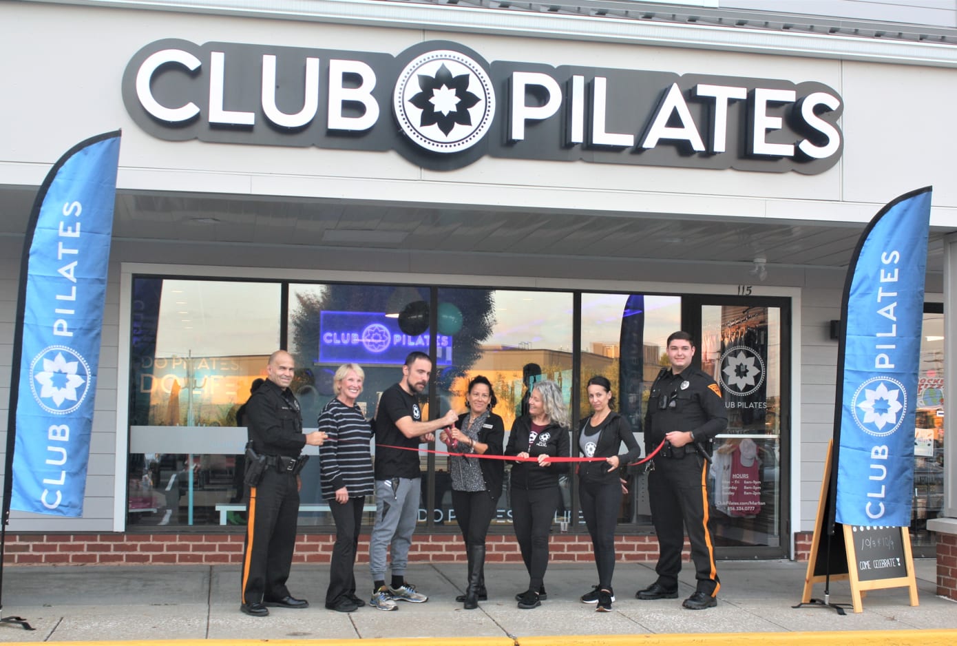 Staff and Evesham Township officials cut the ribbon on South Jersey’s first Club Pilates studio on Friday, Oct. 7, 2022. Located in the Marlton Crossing shopping center, Club Pilates is open seven days a week and is currently offering free 30-minute assessments and limited free memberships for first responders. From left to right: Evesham Police Patrolman and Community Engagement Officer Rich Hernandez; Evesham Councilwoman Patricia Hansen; Club Pilates co-owner Joe Gonzalez; Evesham Deputy Mayor Heather Cooper; Club Pilates instructors Sharon Spaziana and Alessandra Nanni; and Evesham Police Officer Alex Selnek.