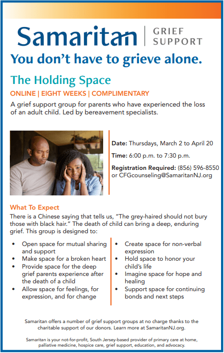 To help South Jersey parents who have suffered this kind of loss, specifically of an adult child, Samaritan is unveiling a new online support group this March – The Holding Space.