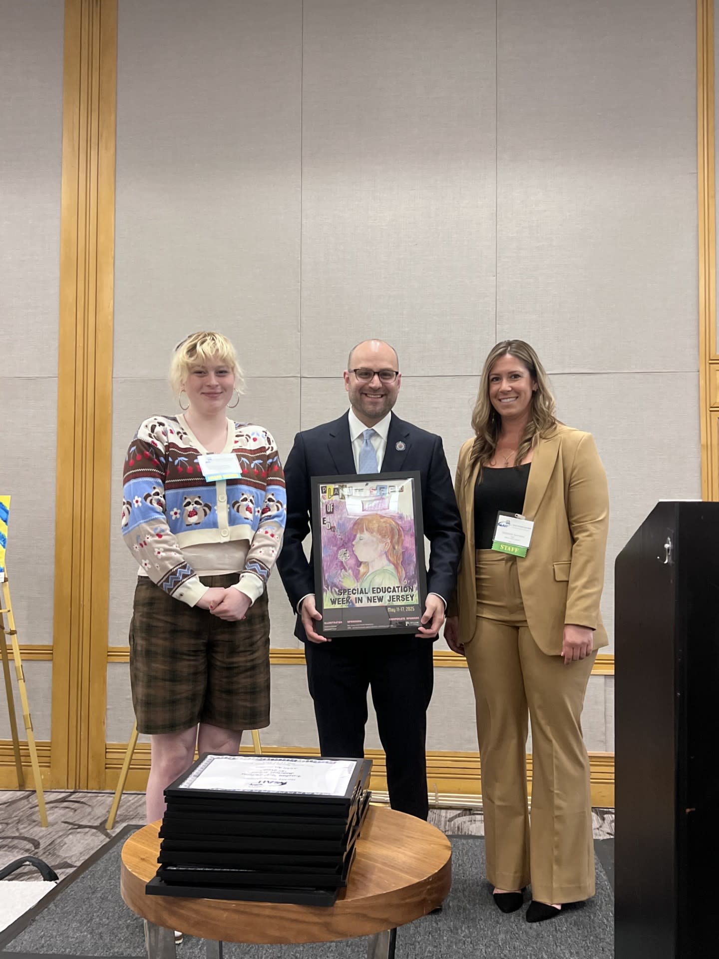 Special Education Week Grand Prize Winner Catherine M. of Holmstead School in Ridgewood poses alongside her award-winning artwork, held by New Jersey Department of Education Commissioner Kevin Dehmer joined with ASAH External Affairs Director Stephanie Summers.