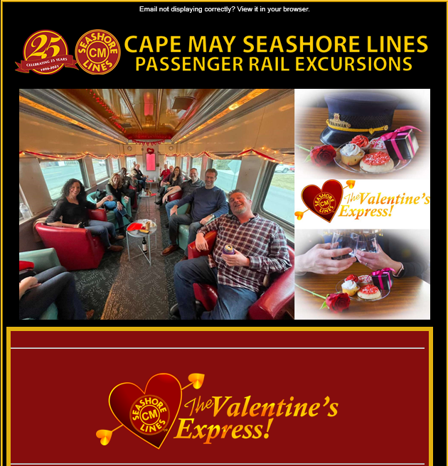MEMBER NEWS & PRESS RELEASES Do you have News to Share? Share your announcements and news articles with fellow CCSNJ members on our website! HOW TO POST NEWS News Posting is a CCSNJ Member-Only Benefit Quick Links MEMBER EVENTS CCSNJ NEWS & PRESS MEMBER DISCOUNTS LEGISLATIVE WORK Back to Member News The Valentine's Express Returns By Cape May Seashore Lines 1/9/2025 Images × Share × Email Facebook LinkedIn X Pinterest Powered By GrowthZone Do you have News to Share? Sign into the Info Hub to add your own member news item: SHARE MY NEWS Member News is a CCSNJ Member-Only Benefit. If you are interested in joining the Chamber, please contact: Heather Sanderson, Director of Membership at (856) 424-8980.
