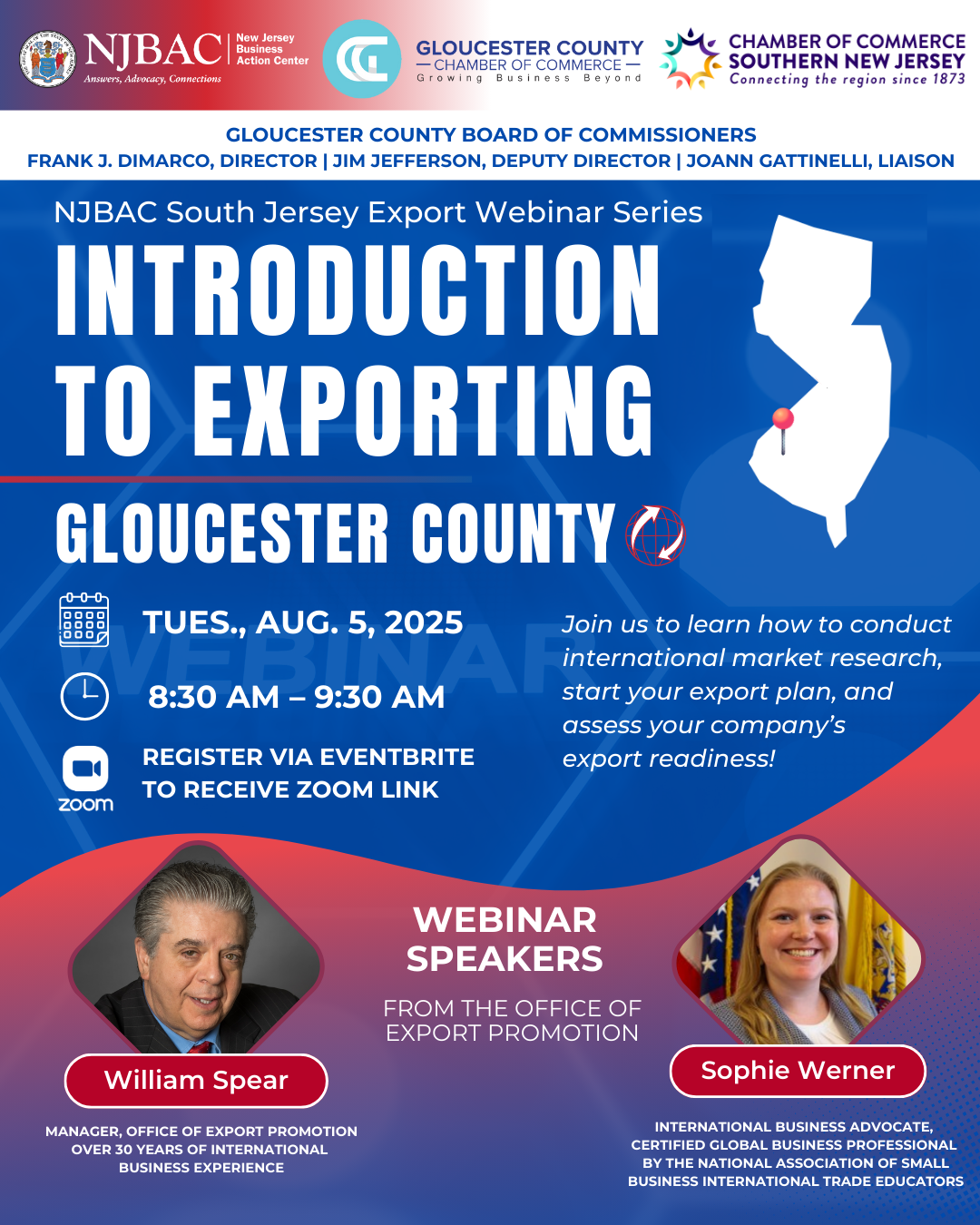 Gloucester County: Introduction to Exporting with NJBAC Quick Links CCSNJ RESOURCE CENTER REOPENING RESOURCES COVID-19 RESOURCES LEGISLATIVE UPDATES CCSNJ NEWS & PRESS BUSINESS DIRECTORY CCSNJ EVENTS Back to CCSNJ Resource Center Updates Gloucester County: Introduction to Exporting with NJBAC By Chamber of Commerce Southern New Jersey 7/30/2025 Register HERE Images × Share × Email Facebook LinkedIn X Pinterest Powered By GrowthZone