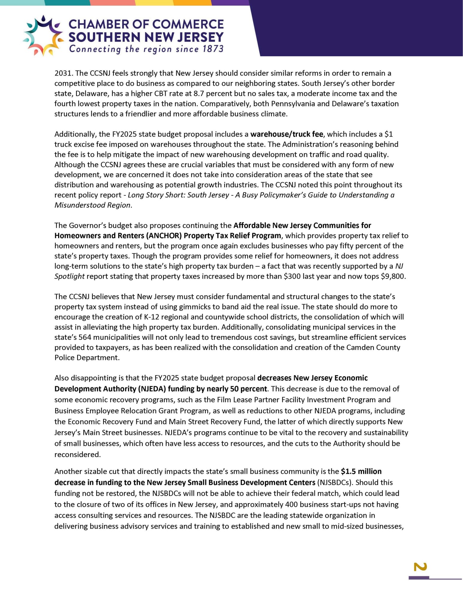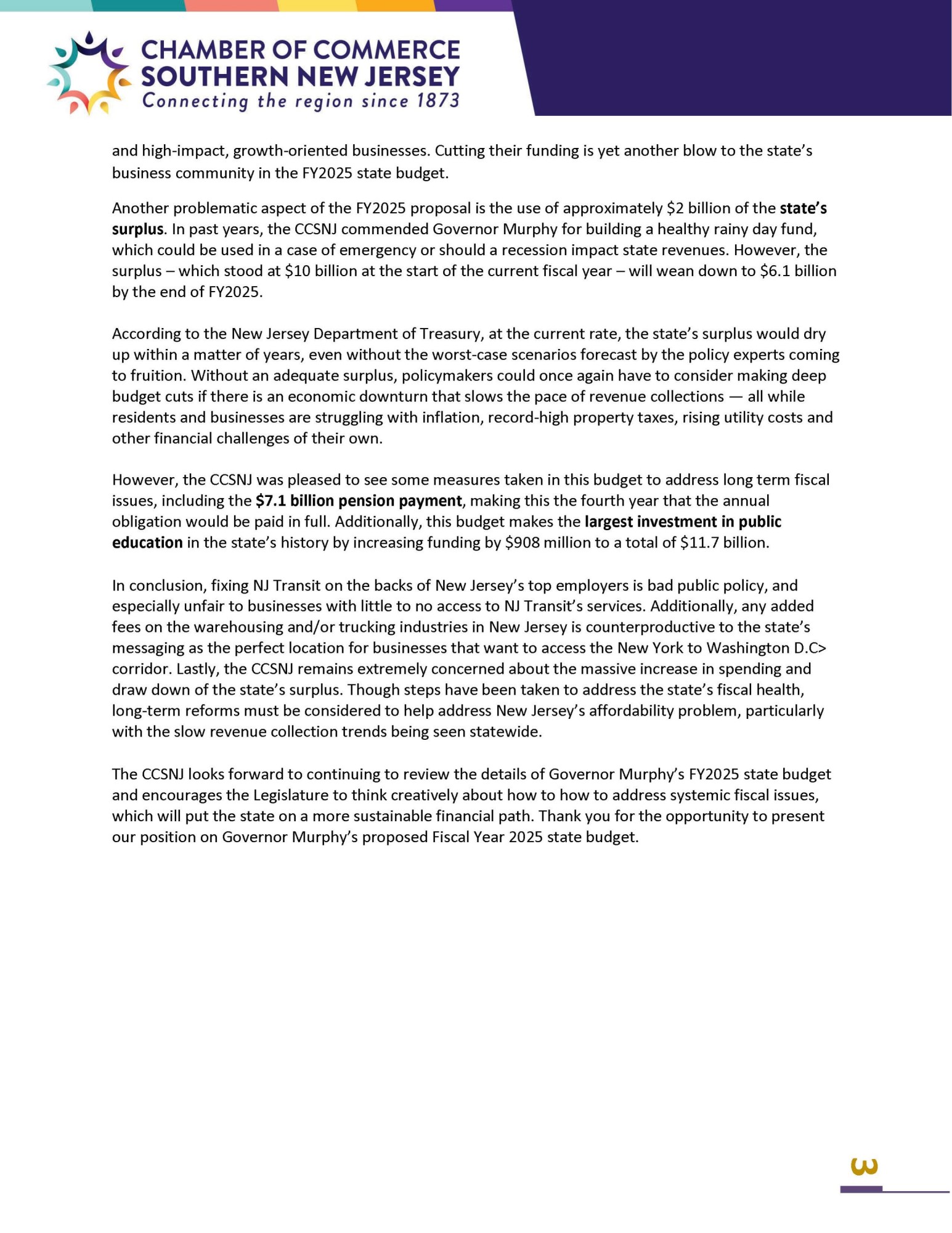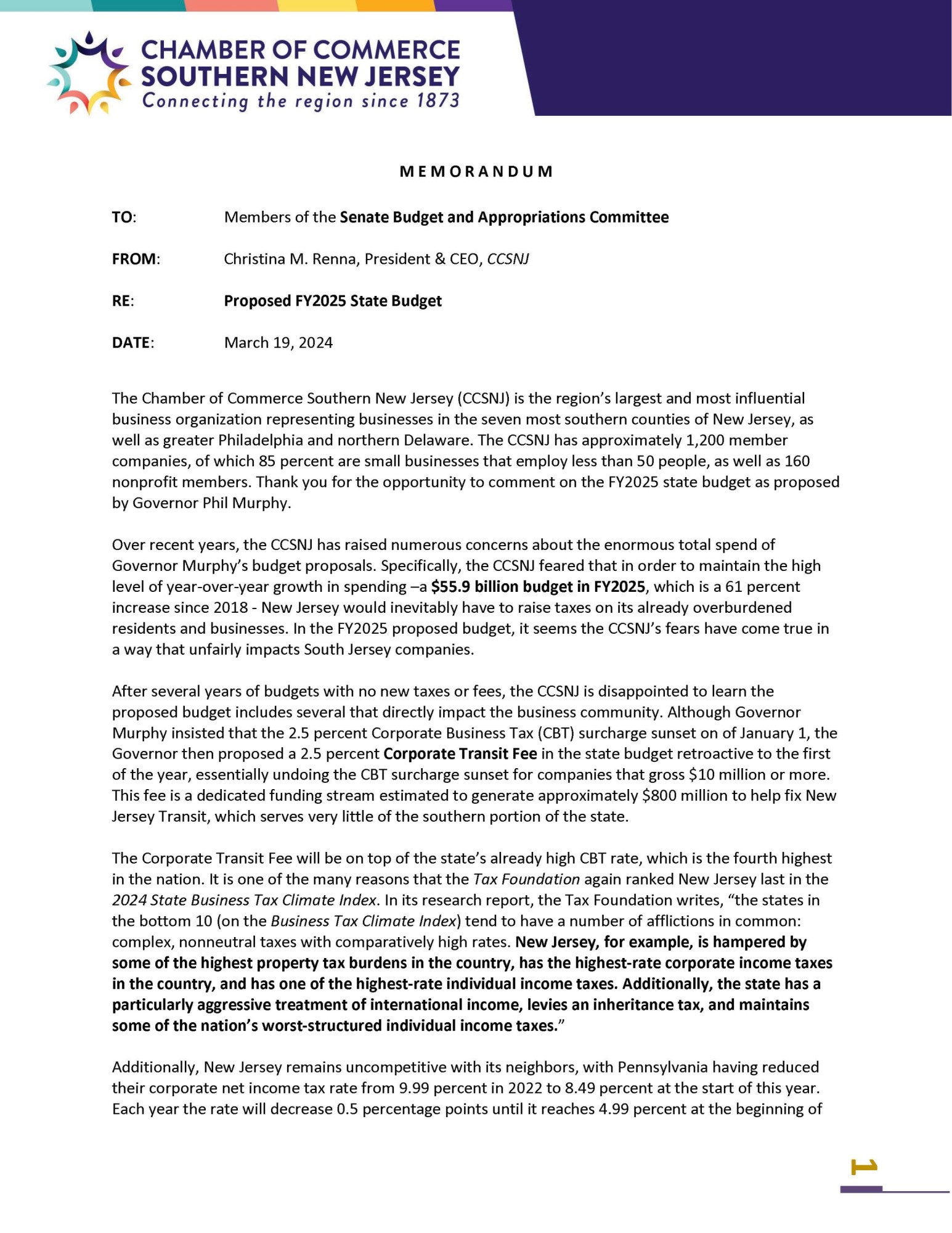 Position Papers CATEGORIES COVID-19 VIEW ALL DEIB VIEW ALL ECONOMIC DEVELOPMENT VIEW ALL ENERGY VIEW ALL ENVIRONMENT VIEW ALL HEALTHCARE VIEW ALL LABOR + WORKFORCE VIEW ALL STATE BUDGET VIEW ALL TAXATION VIEW ALL TRANSPORTATION + INFRASTRUCTURE VIEW ALL Back to Position Papers CCSNJ FY2025 State Budget Testimony By Christina Renna 3/20/2024 Images × Share × Email Facebook LinkedIn X Pinterest Powered By GrowthZone Your Feedback is Important to Us! For any Government-related comments, questions or suggestions please contact: Hilary Chebra Manager, Government Affairs, CCSNJ SUBMIT FEEDBACK